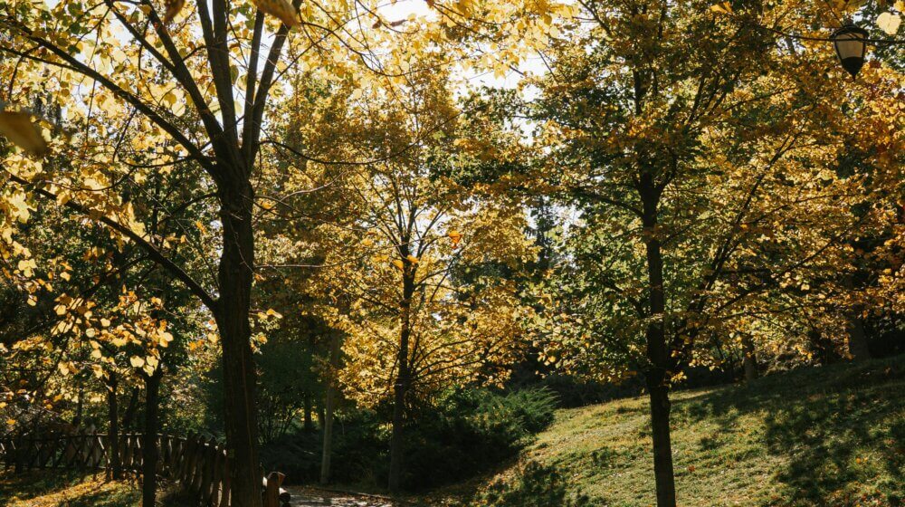 park with trees and person running in the early morning
